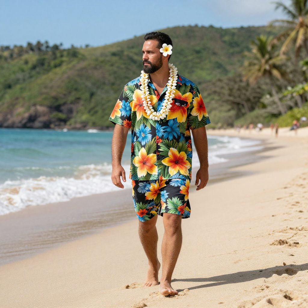 Photograph of a muscular, bearded man with medium brown skin walking on a sunny tropical beach. He wears a colorful Hawaiian shirt with large orange and yellow hibiscus flowers, blue and green leaves, and a white floral lei around his neck. A white hibiscus flower adorns his left ear. His dark hair is short. The beach has white sand, gentle waves, and a lush green hillside in the background. Palm trees line the right side, and the sky is clear blue. The man is barefoot, with a relaxed, confident posture.