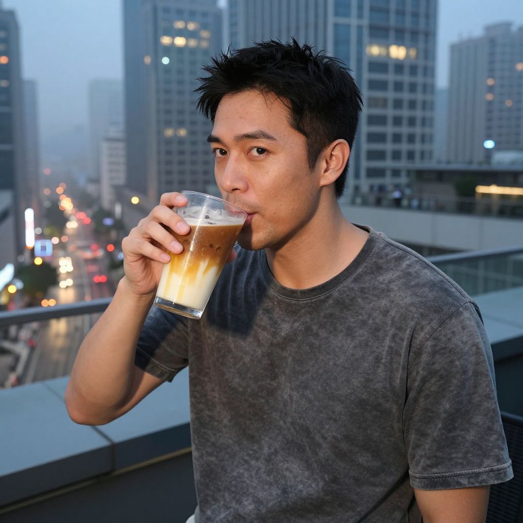A stylish man in his 30s with short black hair, a relaxed expression, and wearing a faded band tee sips a large glass of iced coffee on a rooftop in a modern city at dusk, the coffee glowing with a mix of milk and vanilla syrup, city lights reflecting in the background, fog lightly hugging the streets below.
