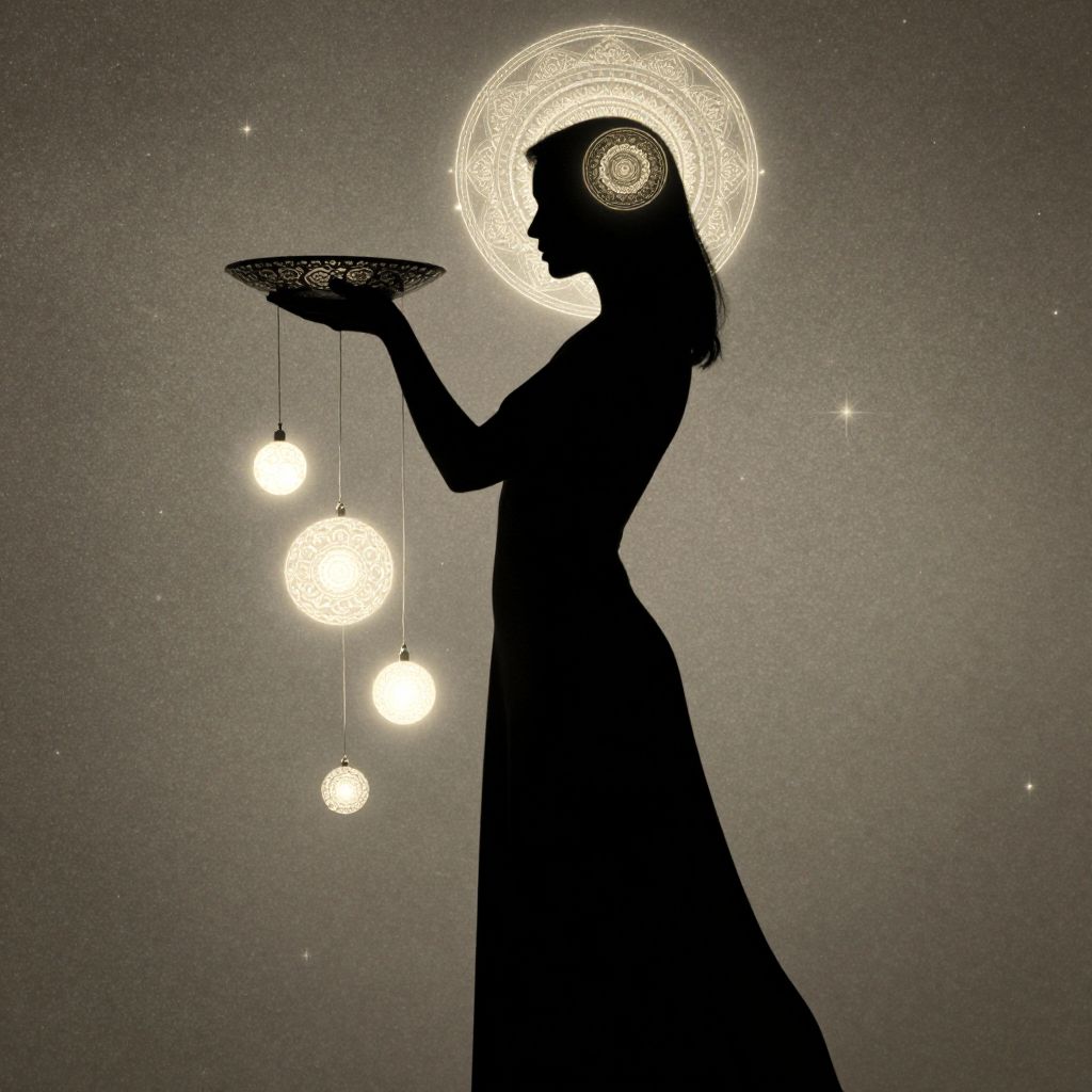 In this captivating image, a silhouette of a woman stands gracefully, her figure outlined against a starry, textured background. She holds a plate adorned with intricate patterns, from which a series of glowing orbs hang, each connected by delicate threads. The orbs vary in size, creating a sense of depth and dimension. The woman's head is adorned with a complex, circular pattern, reminiscent of a mandala, radiating light and energy. The overall composition is balanced, with the woman centrally positioned, the orbs cascading down her body, and the starry background providing a serene, cosmic backdrop. The interplay of light and shadow, along with the detailed textures and patterns, creates a sense of mystique and wonder, evoking themes of transformation and enlightenment.