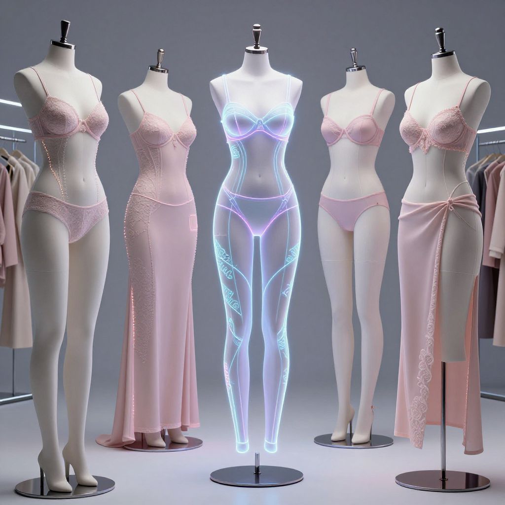 AI lingerie generator concept art, futuristic fashion design studio showcasing diverse holographic lingerie patterns, elegant digital textiles, neon glowing accents, photorealistic style with intricate lace details and surreal artistic lighting