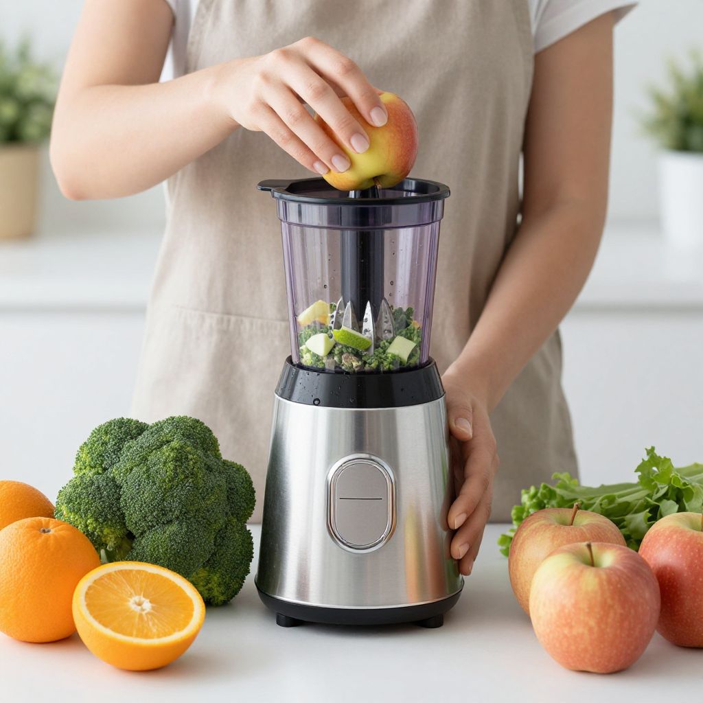 Woman preparing a vibrant fruit and vegetable smoothie by placing an apple into a sleek juicer machine, surrounded by fresh broccoli, oranges, and apples, embodying a healthy lifestyle and eco-friendly vegan diet.