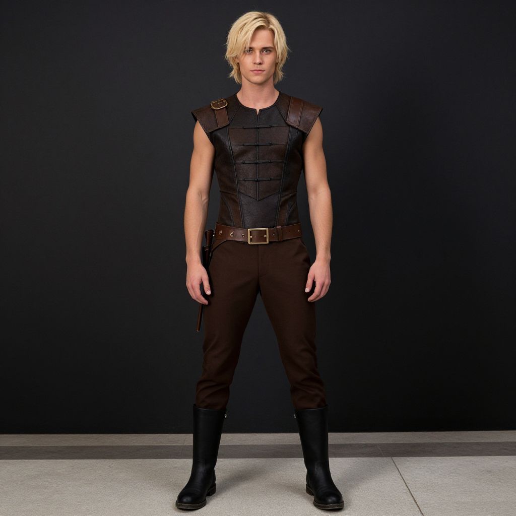 "hunger games dress costume, 1boy, male focus, solo, standing, boots, full body, belt, closed mouth, blonde hair Realistic photo of casual sexy person with pretty face"