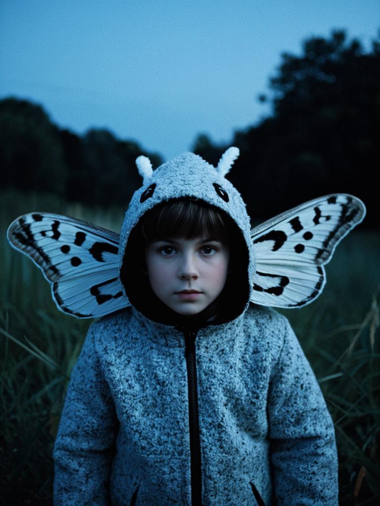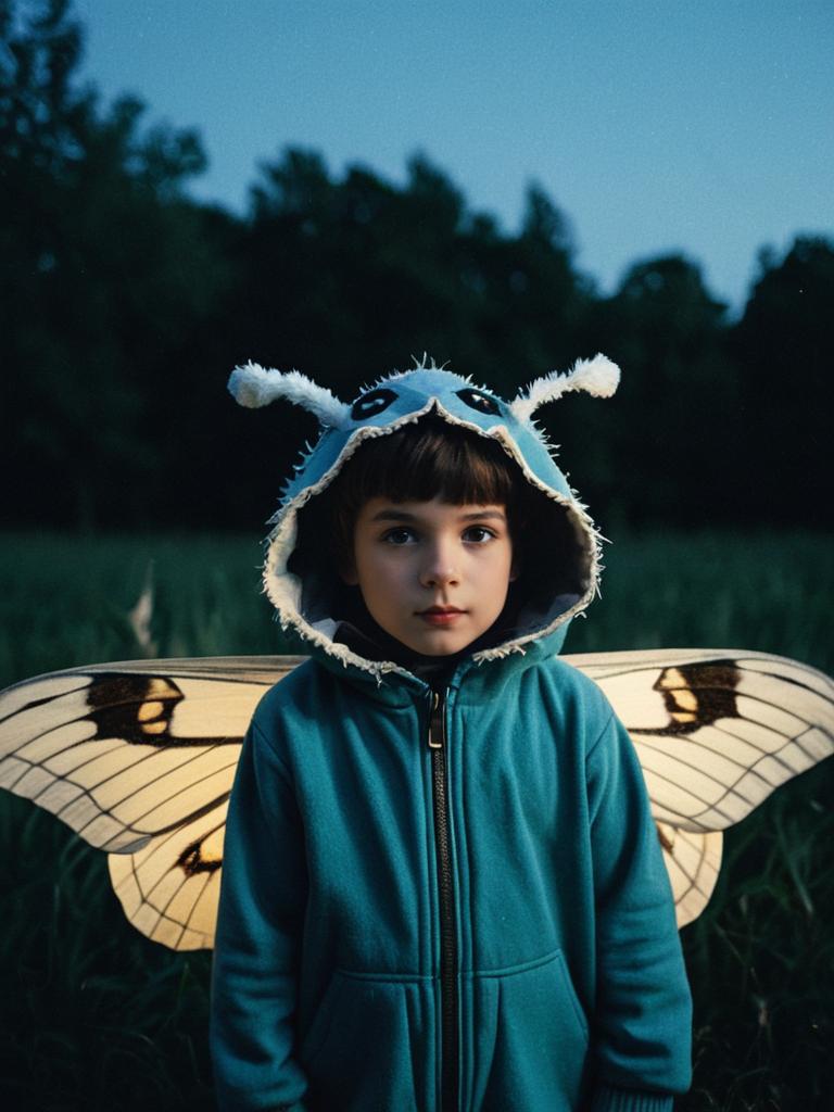 Boy in Moth Costume, photorealistic outdoor portrait at twilight