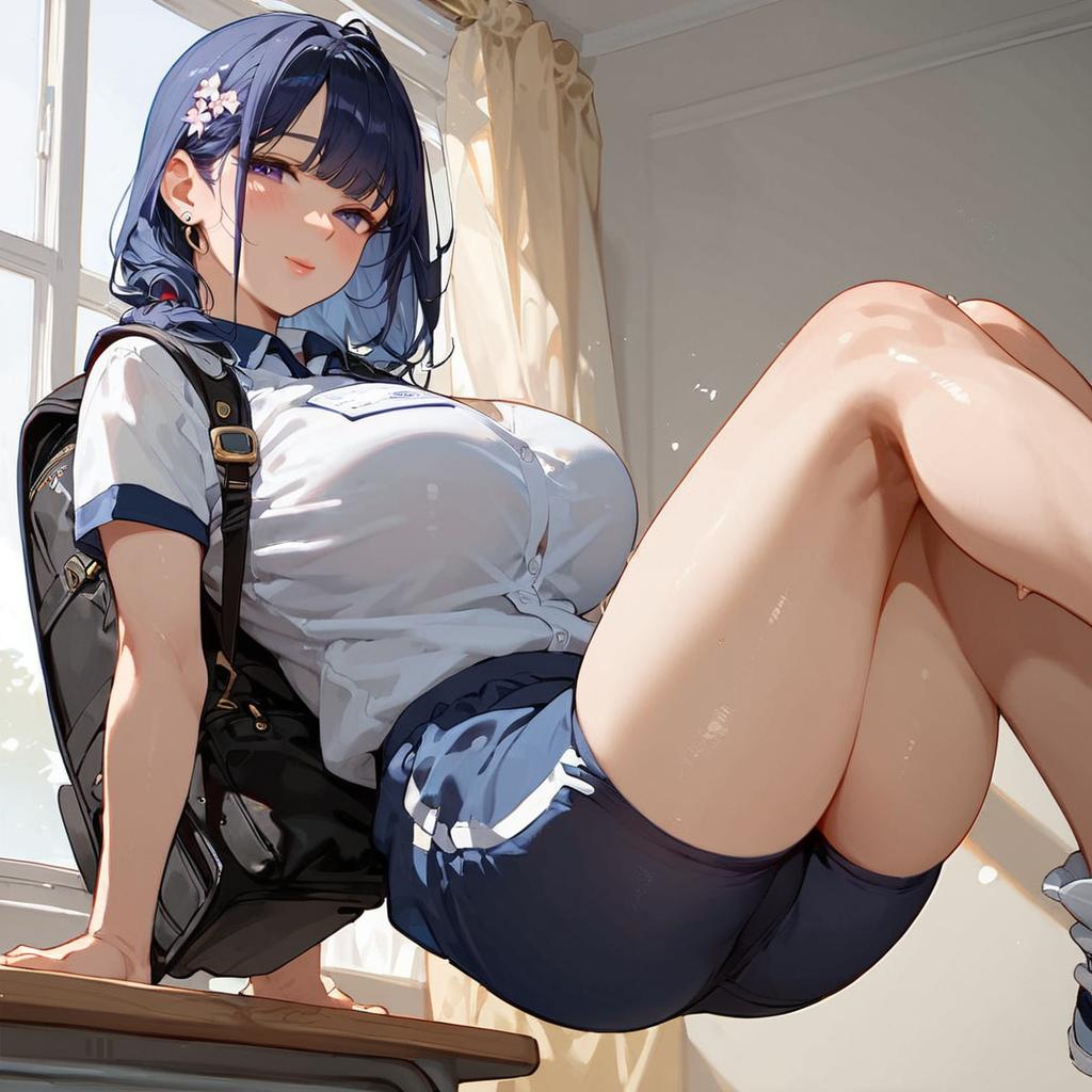 Score_9, score_8_up, score_7_up, best quality, masterpiece, source_anime, 1girl, Japanse MILF with friendly smile and large breast is wearing navy buruma and short sleeve (white gym uniform with colored hem:1.0) and carrying (randoseru backpack:1.5) standing in classroom, view from front