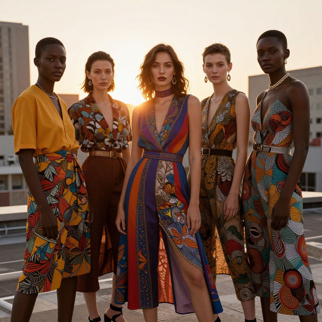 Blasian models showcasing vibrant high fashion on an urban rooftop at sunset, glowing warm light highlighting their diverse features, bold colorful garments with intricate patterns, modern and elegant poses, cinematic style photography, soft background bokeh