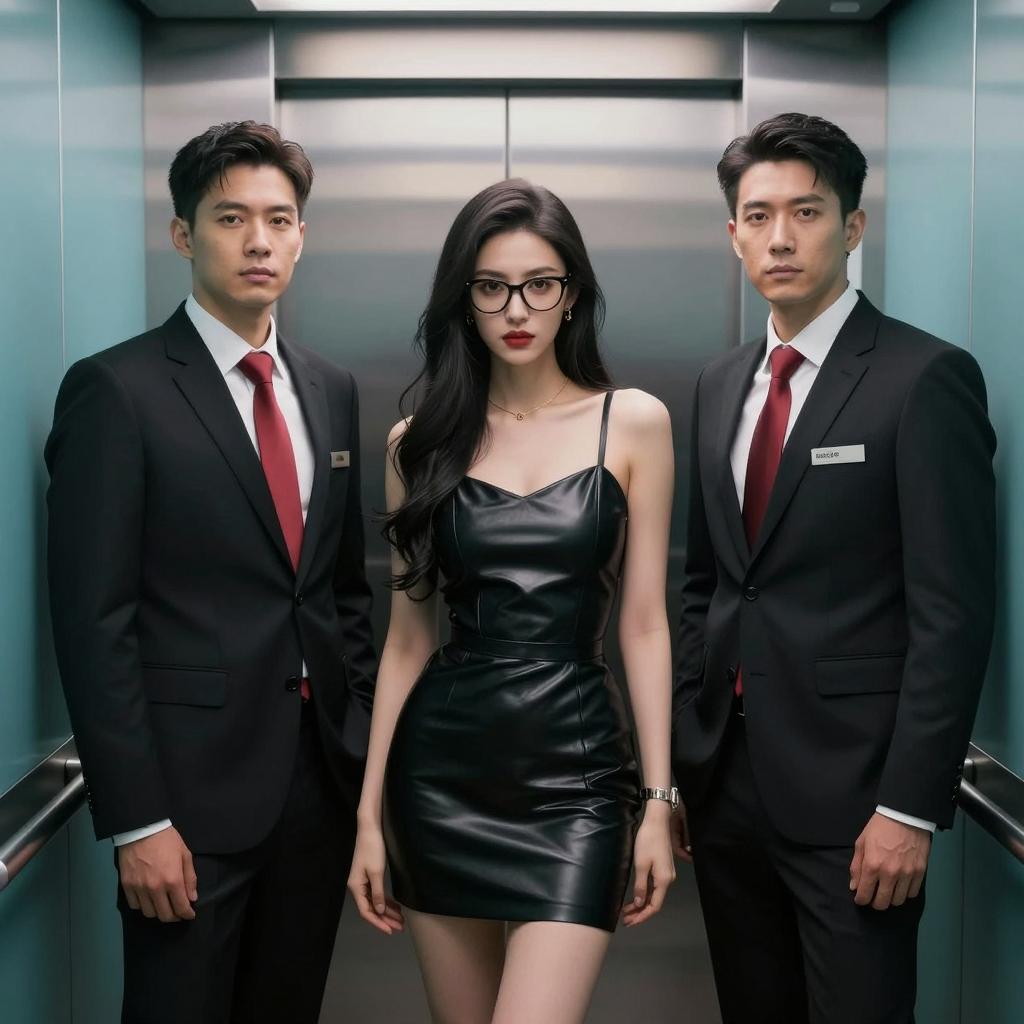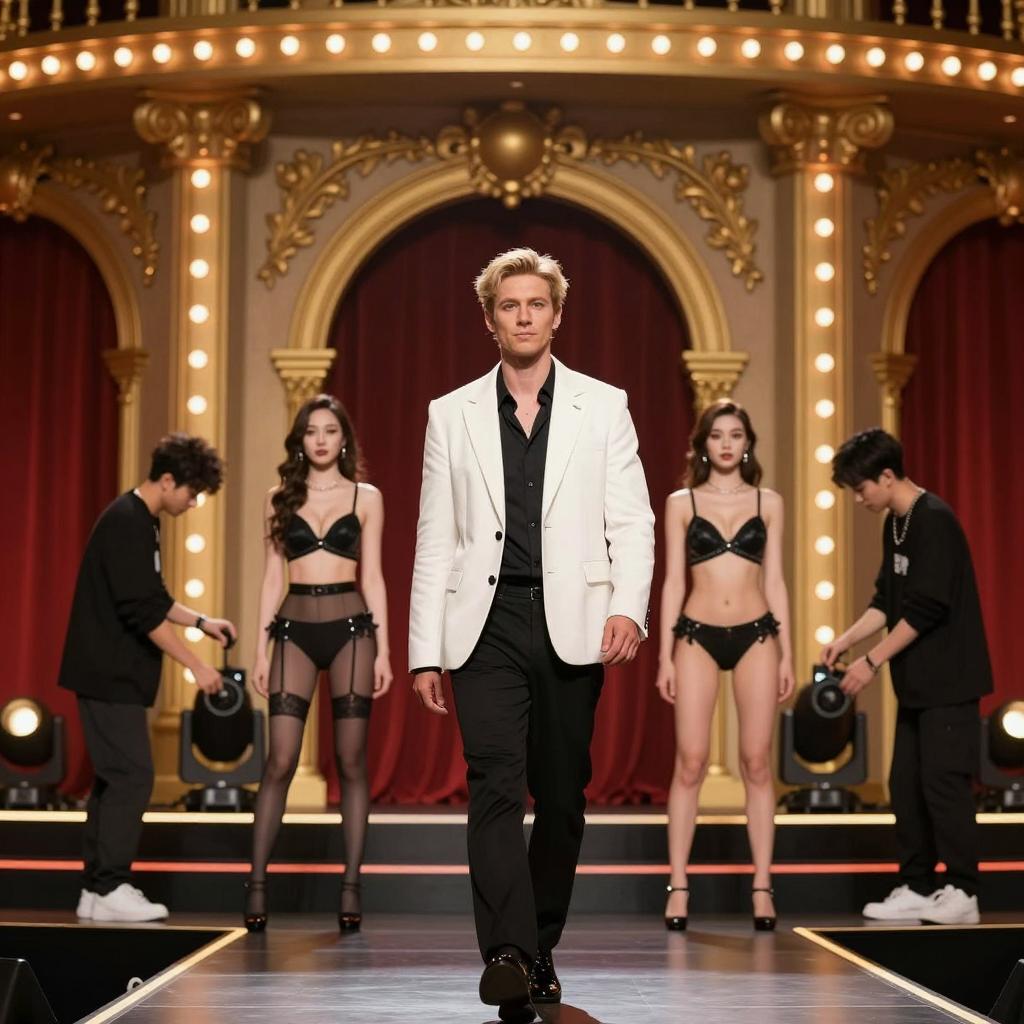 A man with blonde hair, wearing a white jacket and black shirt, walks center stage. Two women in revealing costumes stand behind him. Two men in dark clothing adjust equipment. Ornate golden and red stage background. Strings of lights above. Four people total. The man has a neutral expression.