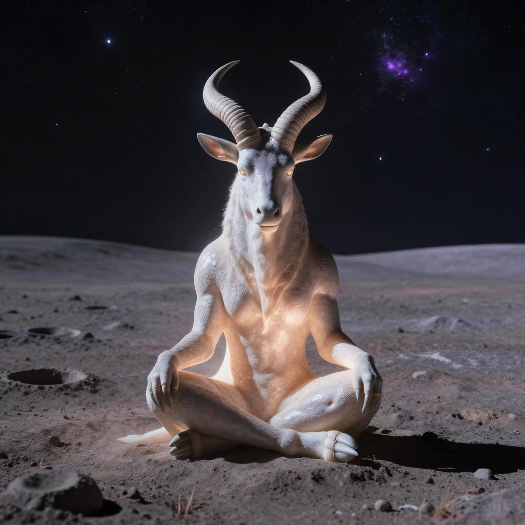 Ancient starlit centaur sitting in a meditative pose on the deserted lunar garden. The scene has an ethereal, otherworldly vibe, with soft, glowing light radiating from the centaur, illuminating the barren, cratered landscape around them. The color palette features dusty grays and subtle violets, enhancing the tranquil, cosmic atmosphere. The composition is serene and surreal, capturing a sense of calm and introspection in the vastness of space.