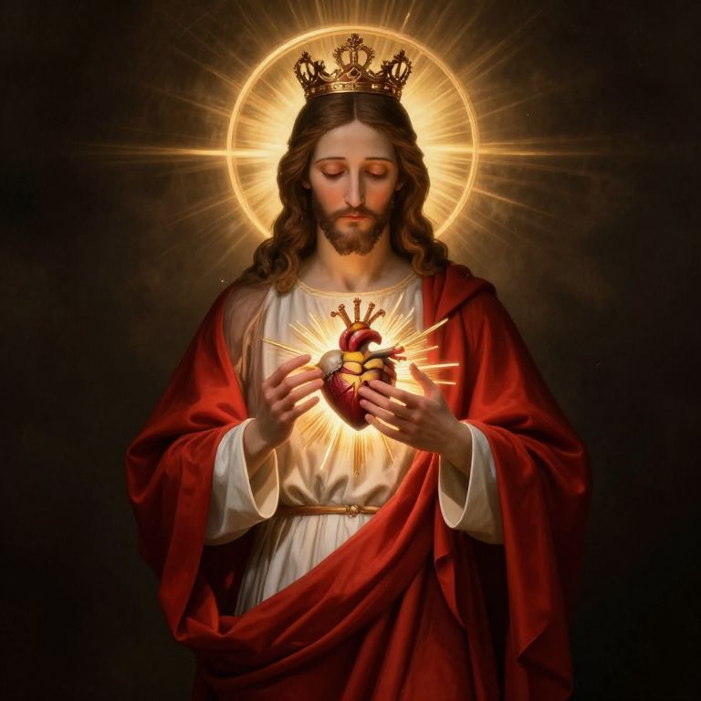 Radiant depiction of the Sacred Heart of Jesus, featuring a figure draped in a flowing red robe over a white tunic, with hands tenderly cradling a glowing heart emblem adorned with golden rays and a crown atop, set against a dark, ethereal background illuminated by a golden halo above.