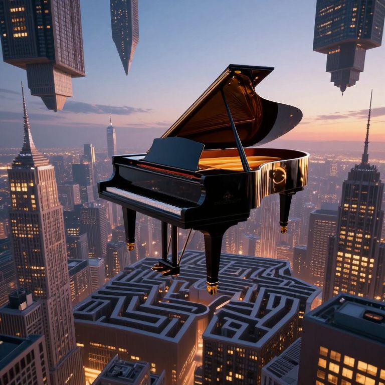 Grand piano with golden wings soars gracefully above a labyrinthine cityscape at twilight, its polished surface reflecting the warm glow of countless windows as it hovers amidst towering skyscrapers and inverted architectural marvels.