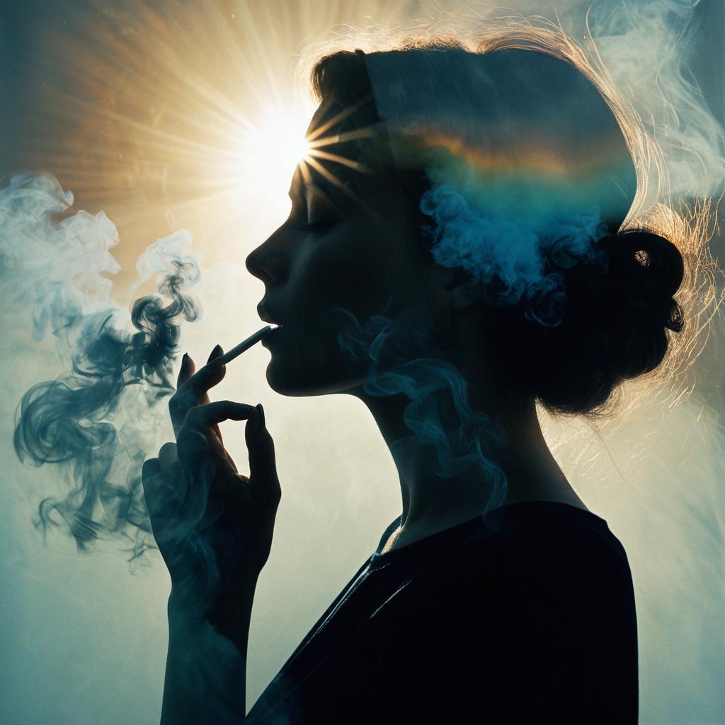 Sleepy fashion model silhouette smoke, soft sun light, fog, fuzzy iridescent glare, poster art, high detail, intricate oil painting, multiple exposure, vouge cover style, by stanley kubrick and greg rutkowski