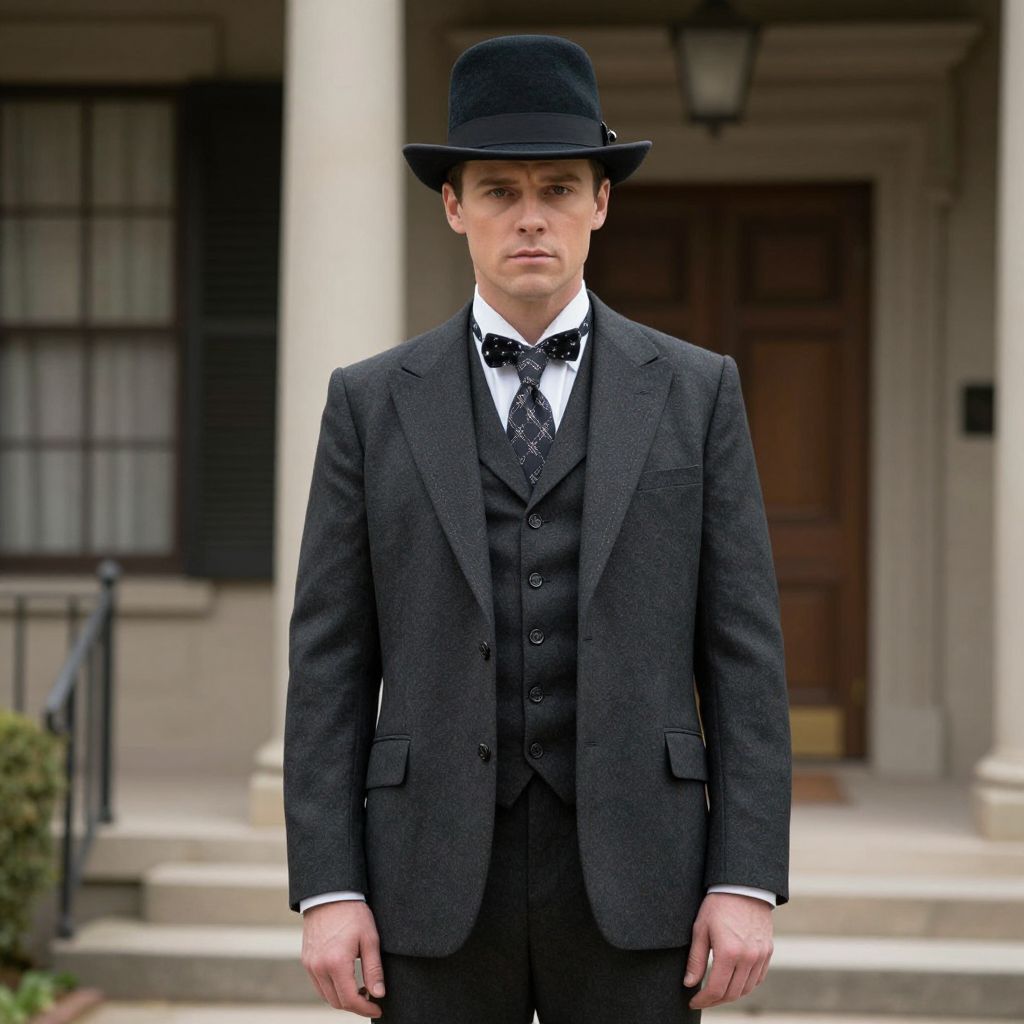 Great Gatsby Costume Male, man in a suit and hat standing in front of a building