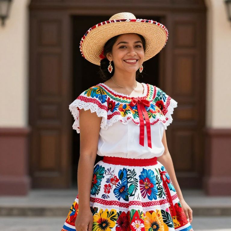 Female wearing a colorful Mexican dress with a straw hat on her head.