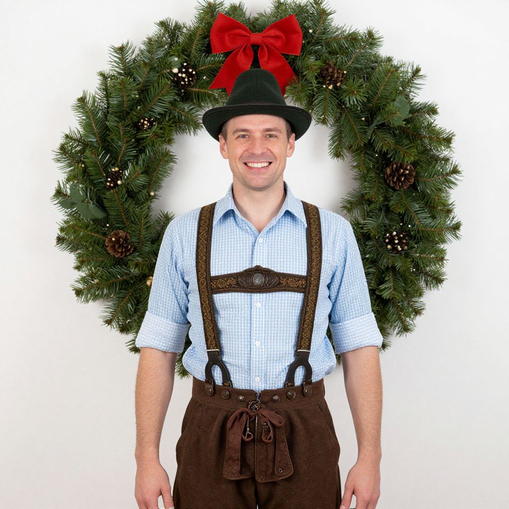 "Bavarian Beer Costume, man in a hat and suspenders standing in front of a christmas wreath"