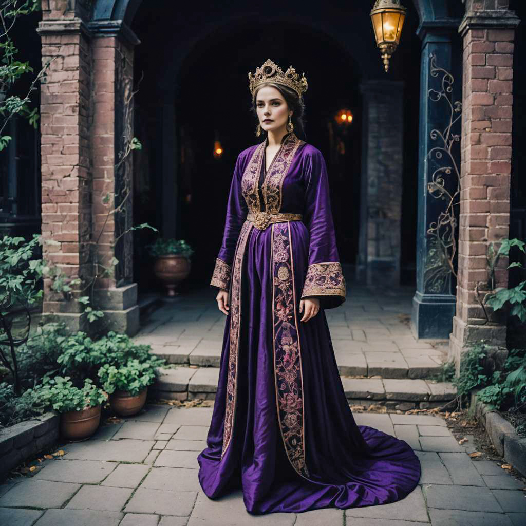 Portrait of a woman with hourglass figure wearing a braided crown and an opium-inspired outfit. She is dressed in a dark, mysterious ensemble featuring flowing aubergine robes made of Tussar silk with intricate embroidery, standing in a historic brick courtyard with vintage lantern lighting. The image has a lomography style mood.