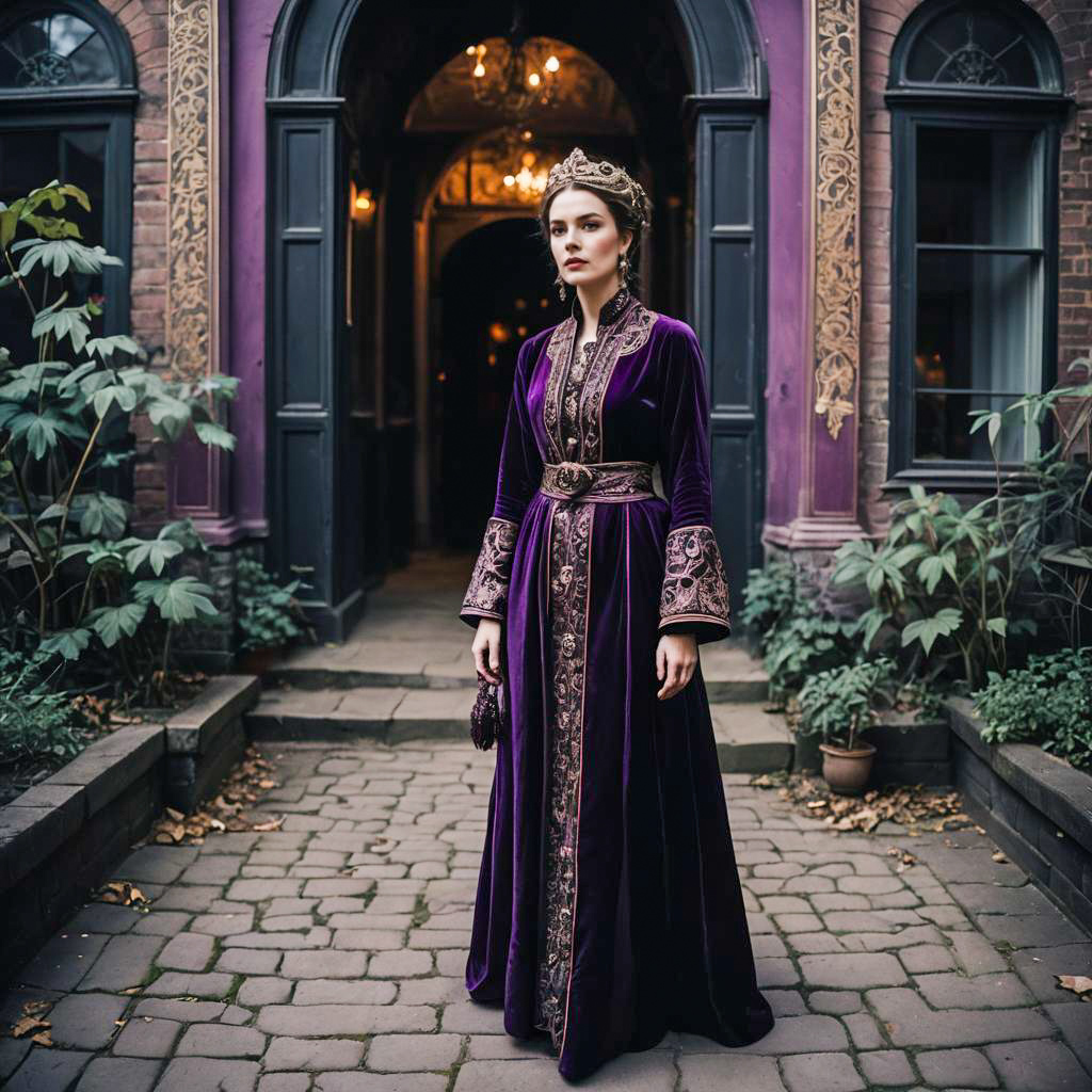 Photo of a Hourglass shaped woman, Braided Crown, opium outfit, dark and mysterious ensemble featuring Aubergine flowing robes with Tussar silk and intricate embroidery, velvet slippers, ghost tour in historic district, lomography style