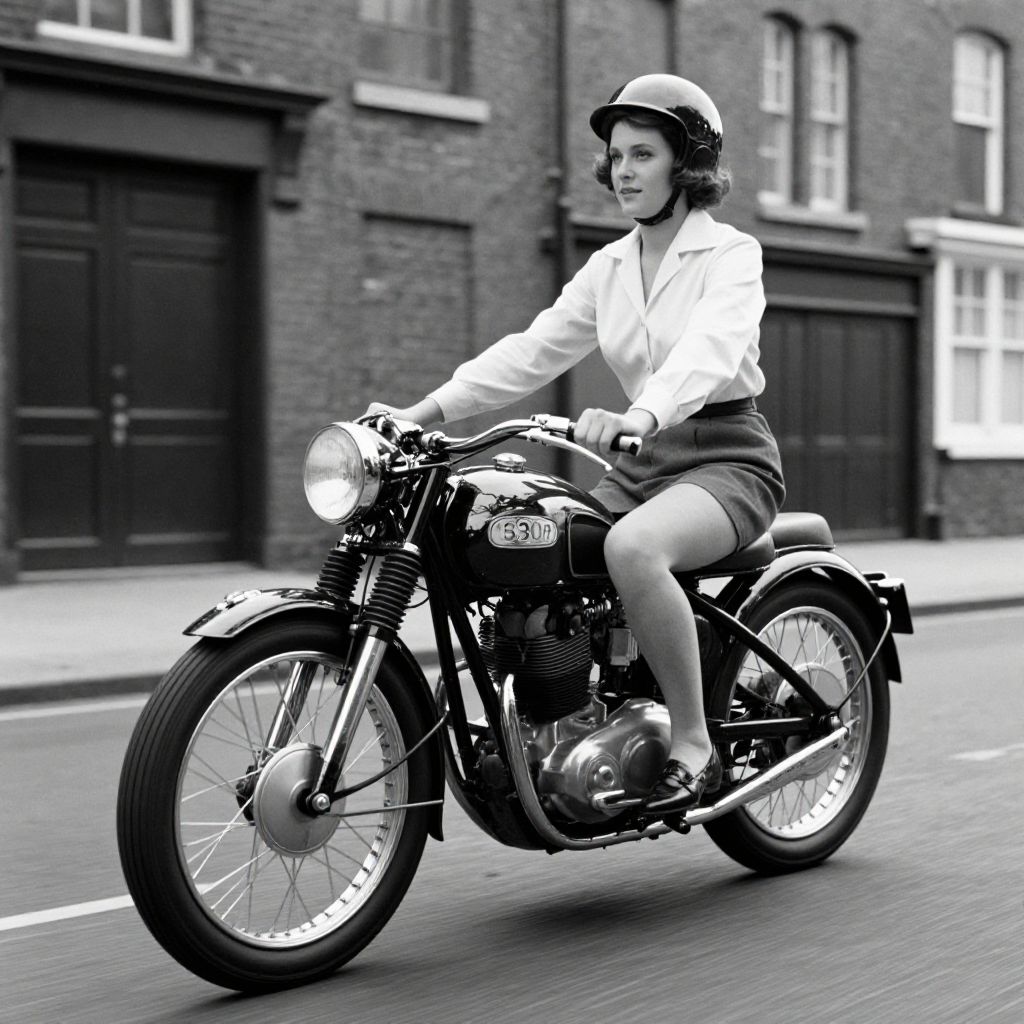 A vintage black-and-white photograph captures a woman riding a classic twin-engine Triumph motorcycle through the streets of Bermondsey in the 1960s, showcasing a nostalgic retro aesthetic with dramatic lighting and high-definition detail.
