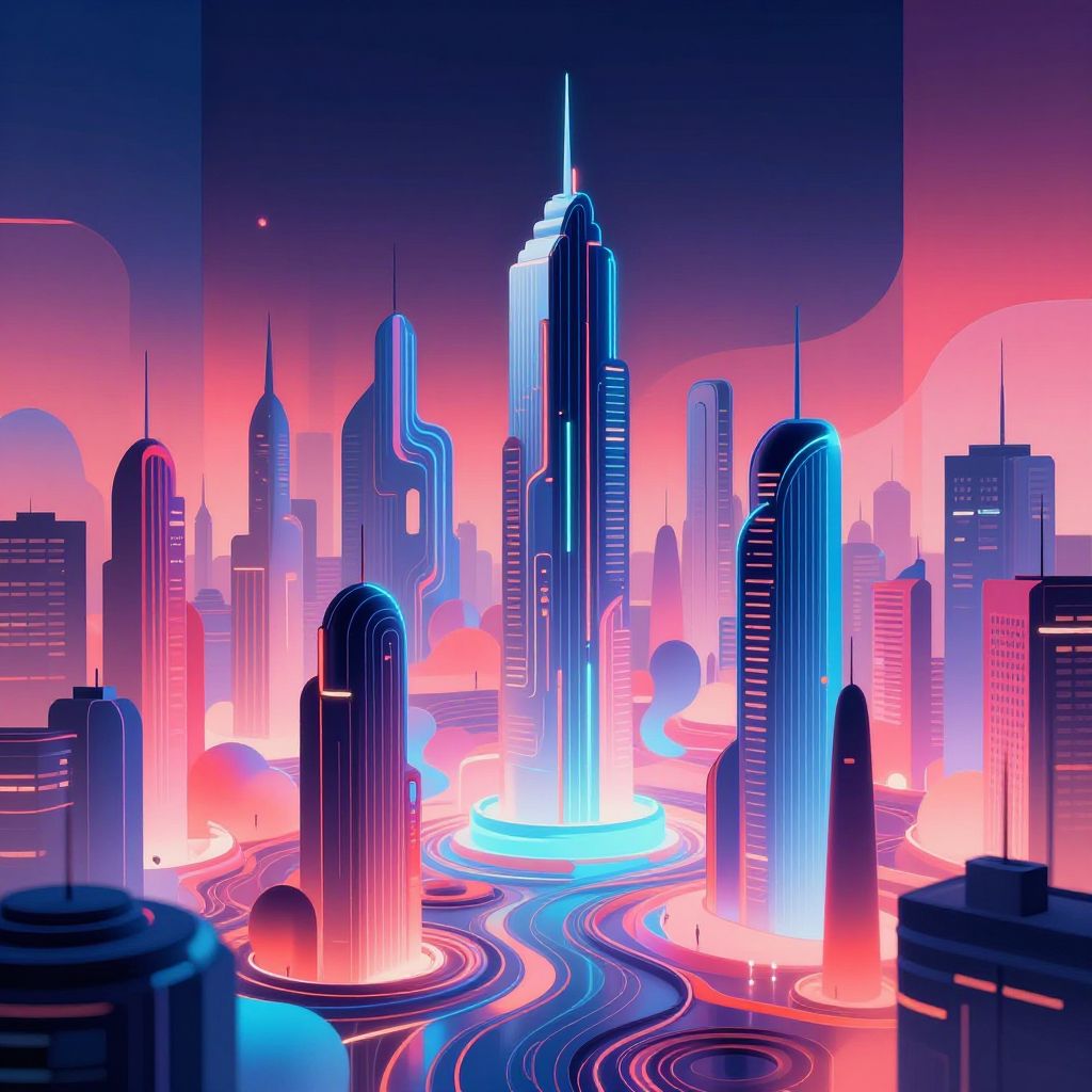 Generative art AI crafting a hyper-detailed cityscape made of abstract shapes and neon lights, with smooth gradients and reflective surfaces, blending cybernetic design with surreal digital art, emphasizing AI-generated complexity and imaginative urban environments.