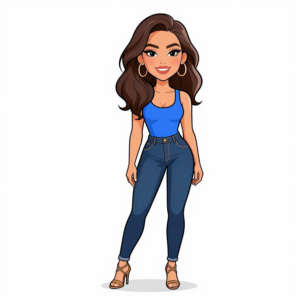 Digital cartoon of a smiling woman with long brown hair, wearing a blue tank top, high-waisted blue jeans, and beige sandals. She has