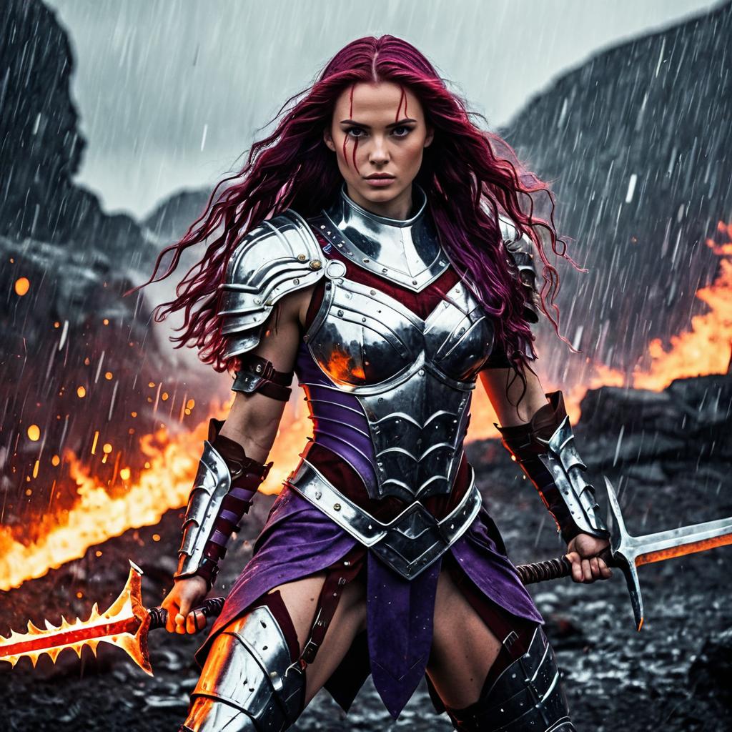Muscular young Nordic female warrior with long wavy violet hair wearing full chrome armor and a purple skirt, wielding two glowing plasma blades. She stands in a dramatic rainy battlefield with fire and rocky landscape in the background, evoking a fierce and intense atmosphere.
