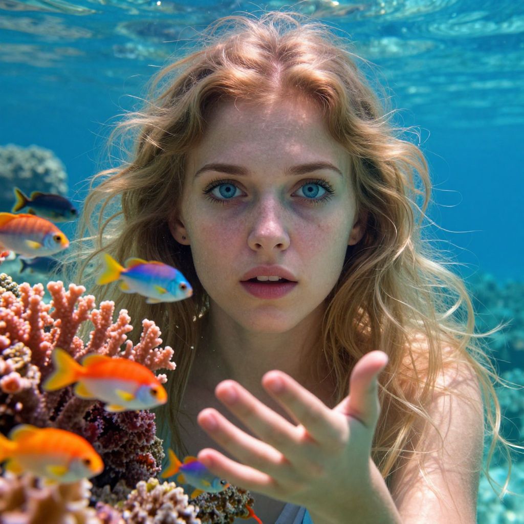 Craft an iPhone portrait of a young woman with long, wavy blonde hair and piercing blue eyes, whose expression exudes curiosity and intrigue. Her face is partially veiled by a vivid overlay of a vibrant coral reef, creating a seamless double exposure. The reef's exotic marine life contrasts with her delicate skin, fusing their colors and patterns harmoniously. She appears to reach out towards schools of neon-hued fish swimming around her, as if drawn to the mysterious depths. Soft, diffused sunlight filters through the water, casting a gentle light on both subjects and adding depth to the scene with subtle shadows. This captivating image presents a unique interplay between humanity and nature, enchanting viewers with the sense of exploring unknown realms within ourselves and our world.