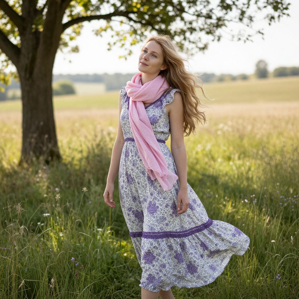 Woman in Floral Dress with Pink Scarf in Meadow