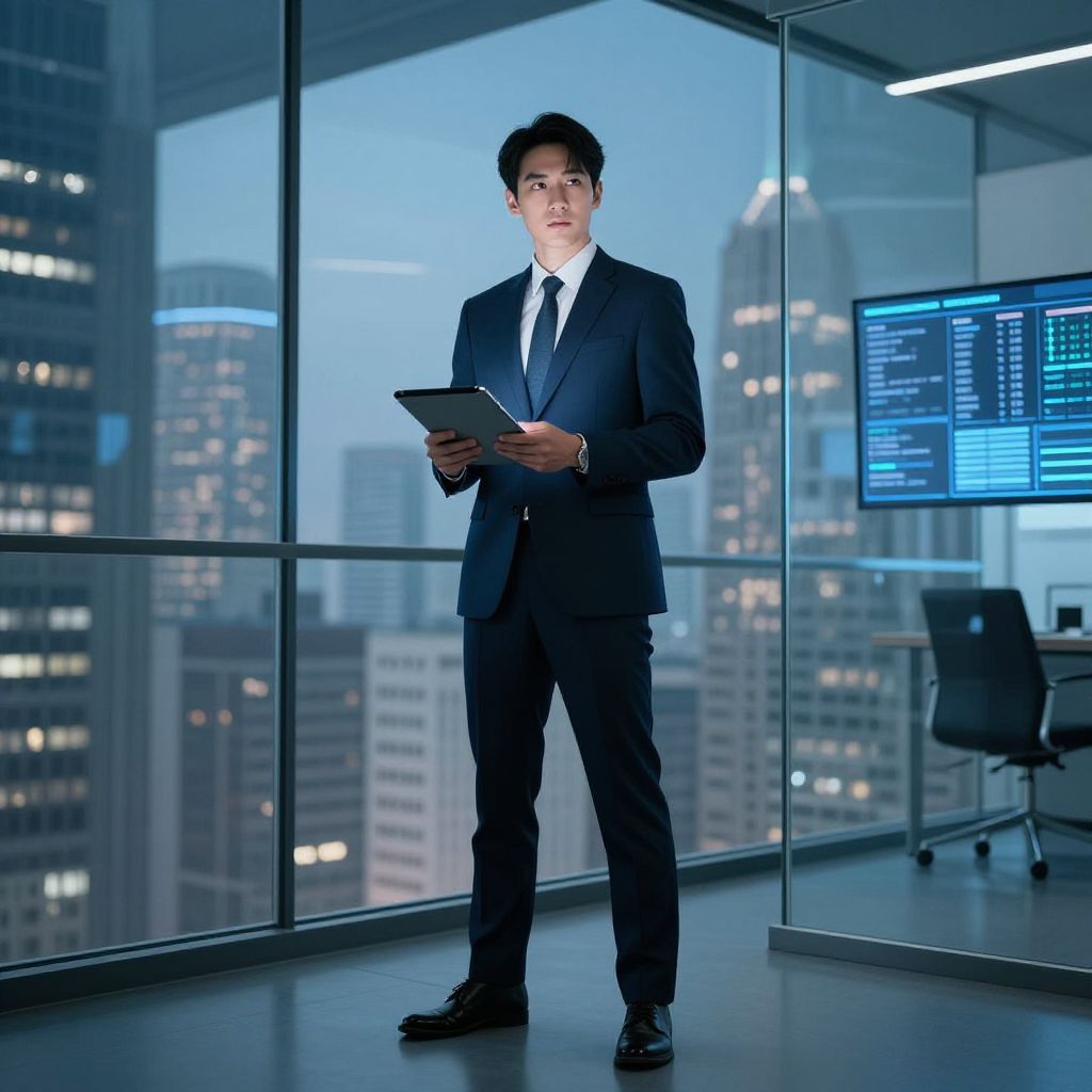Photograph of a young Asian man with short black hair, standing in a modern, high-rise office with large floor-to-ceiling windows. He wears a dark blue suit, white shirt, and black tie, holding a black tablet. The background features a cityscape with illuminated skyscrapers at dusk. Inside the office, there's a desk with a black office chair and two large computer monitors displaying code on the right. The lighting is cool blue, emphasizing the professional and tech-savvy atmosphere. The man has a serious expression and stands confidently in the center of the image.