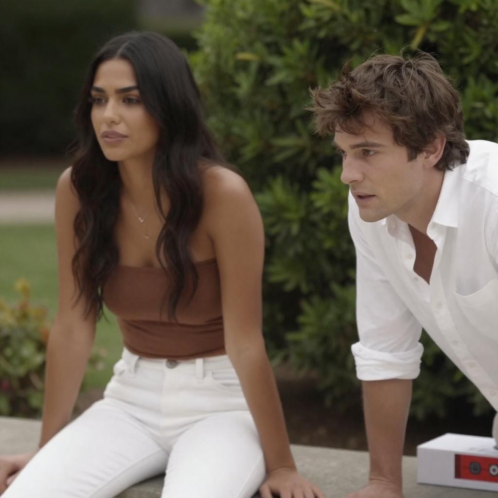 Photograph of a man and woman in an outdoor setting. The woman, with long dark hair and tan skin, sits on a stone ledge wearing a brown strapless top and white pants. The man, with messy brown hair and light skin, leans forward in a white shirt, looking intently to the right. Lush greenery fills the background. A white box with red and black is in the lower right corner.