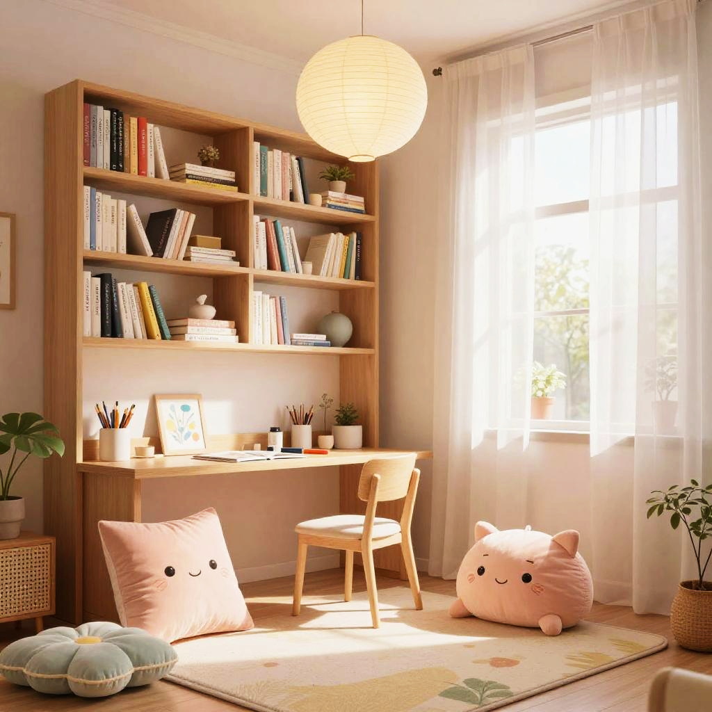Anime bedroom backgrounds featuring cozy pastel colors, soft lighting streaming through sheer curtains, neatly arranged bookshelves, a small desk with art supplies, plush cushions on the floor, and delicate paper lanterns hanging from the ceiling, evoking a peaceful atmosphere.