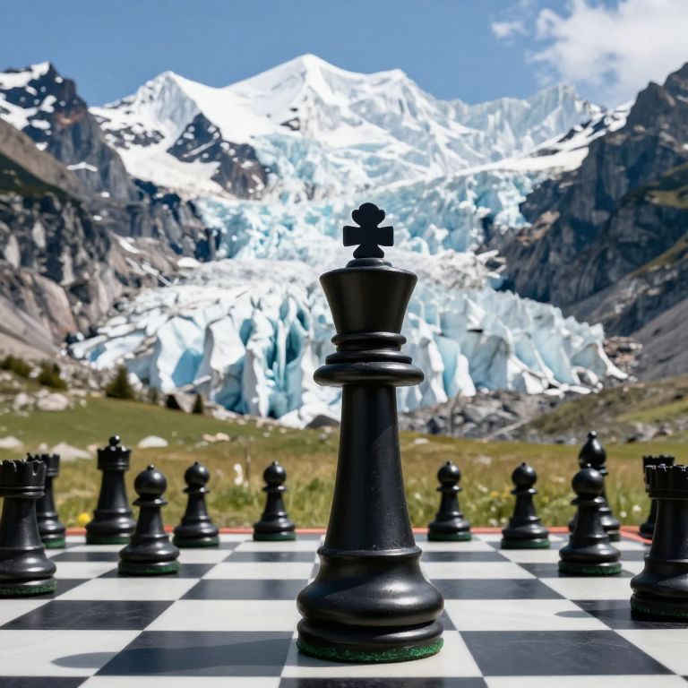 Life-sized chess pieces stand solemnly on a vast checkerboard, with a towering black king dominating the foreground as a massive glacier looms majestically in the background, framed by rugged mountain peaks and a serene meadow.