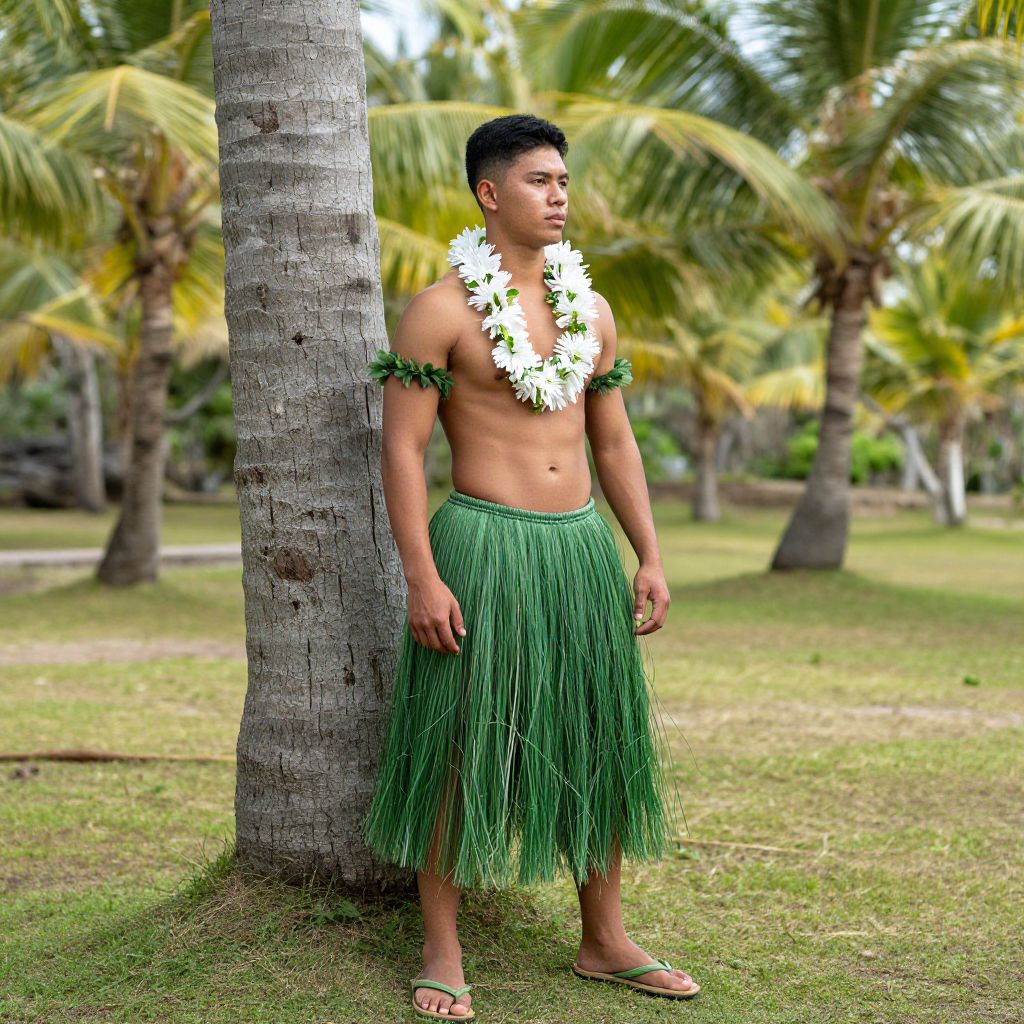 Photograph of a young, muscular, Asian male with short black hair standing against a palm tree in a tropical grassy area. He is shirtless, wearing a green grass skirt and a white floral lei around his neck. His brown skin is smooth, and he has a focused expression. He also wears green armbands and brown flip-flops. The background features several tall palm trees and a lush, green landscape under bright sunlight. The image has a slightly enhanced, hyper-realistic style.