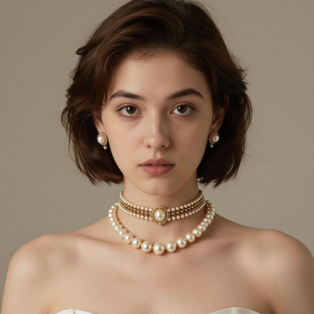 Photograph of a young woman with short dark brown hair, fair skin, wearing pearl and gold jewelry, including a choker and earrings, against a