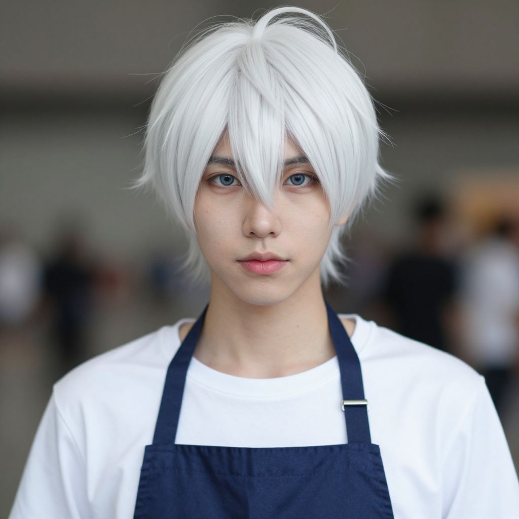 Photograph of a young Asian person with pale skin and striking white, shaggy hair that falls over their forehead and blue eyes. They wear a white shirt under a black apron. The background is blurred, showing indistinct figures and a grey wall, suggesting an indoor setting. The lighting is soft, highlighting the subject's face and hair. The person's expression is neutral, with slightly parted lips. The image has a realistic, somewhat stylized appearance with a focus on the subject's distinctive hair and simple clothing.