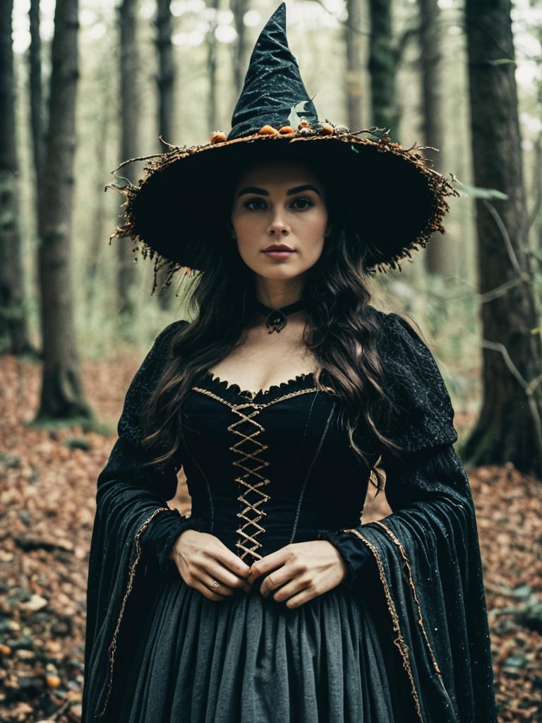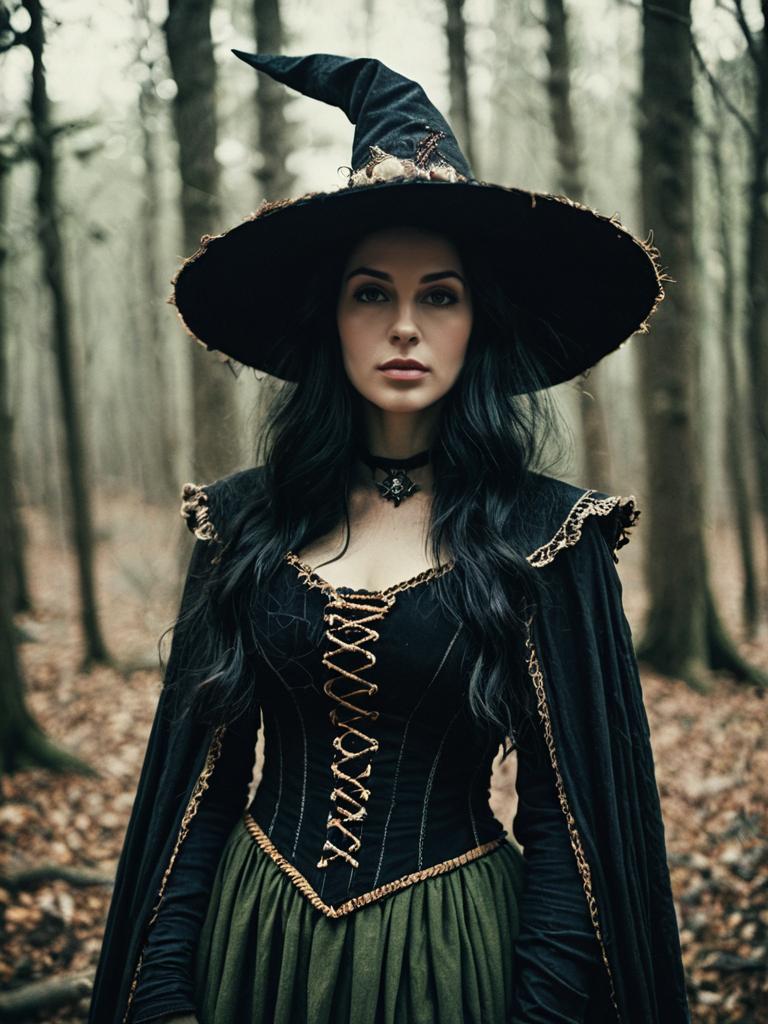 Waist-up portrait of a woman dressed in a detailed black woodland witch costume, featuring a pointed hat and lace-up corset dress, standing in a forest with muted, photorealistic tones. The woman has long dark hair and wears a gothic-style pendant necklace.