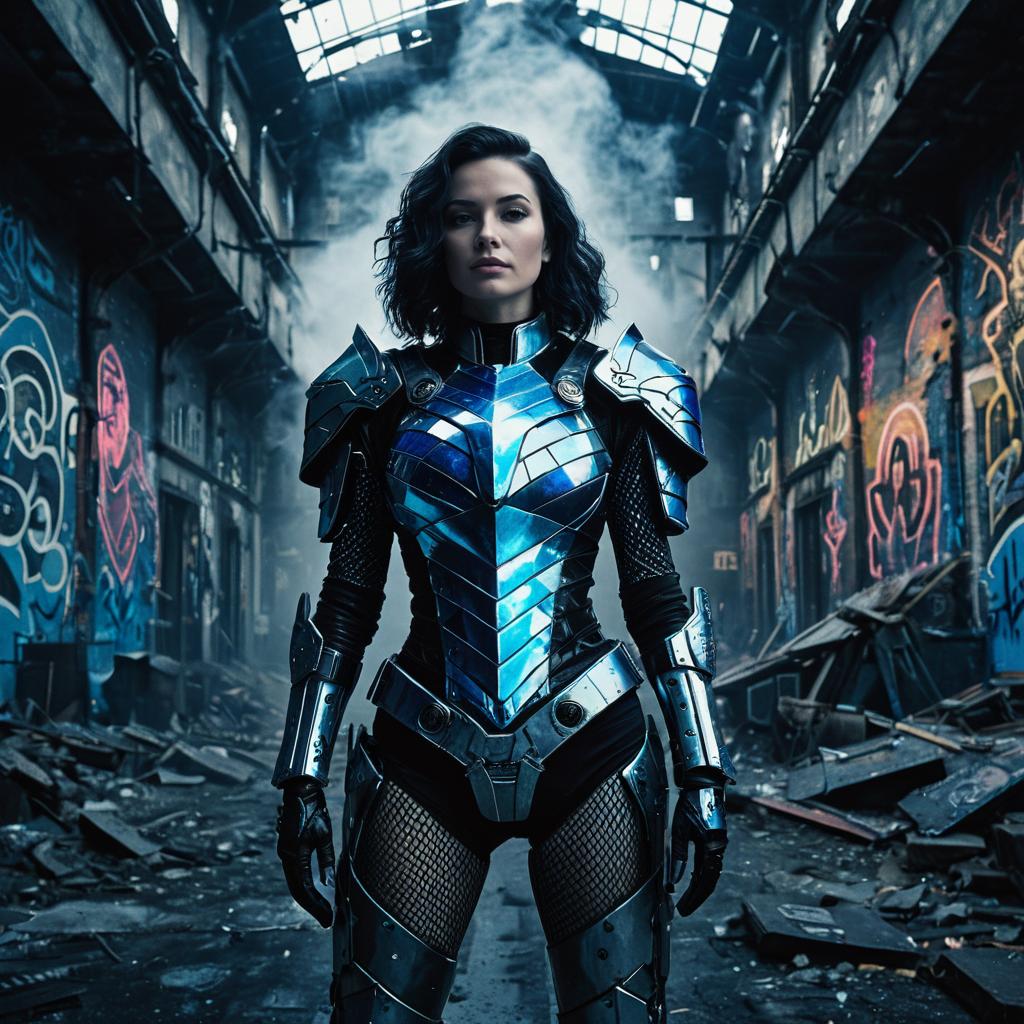 Full body portrait of a female archangel from Diablo walking through a destroyed dive bar, wearing golden plated armor, in cyberpunk neon glow, vibrant colors, high contrast, realistic lighting, photorealistic eyes, detailed facial features, good value control, realistic shading, influenced by John Singer Sargent