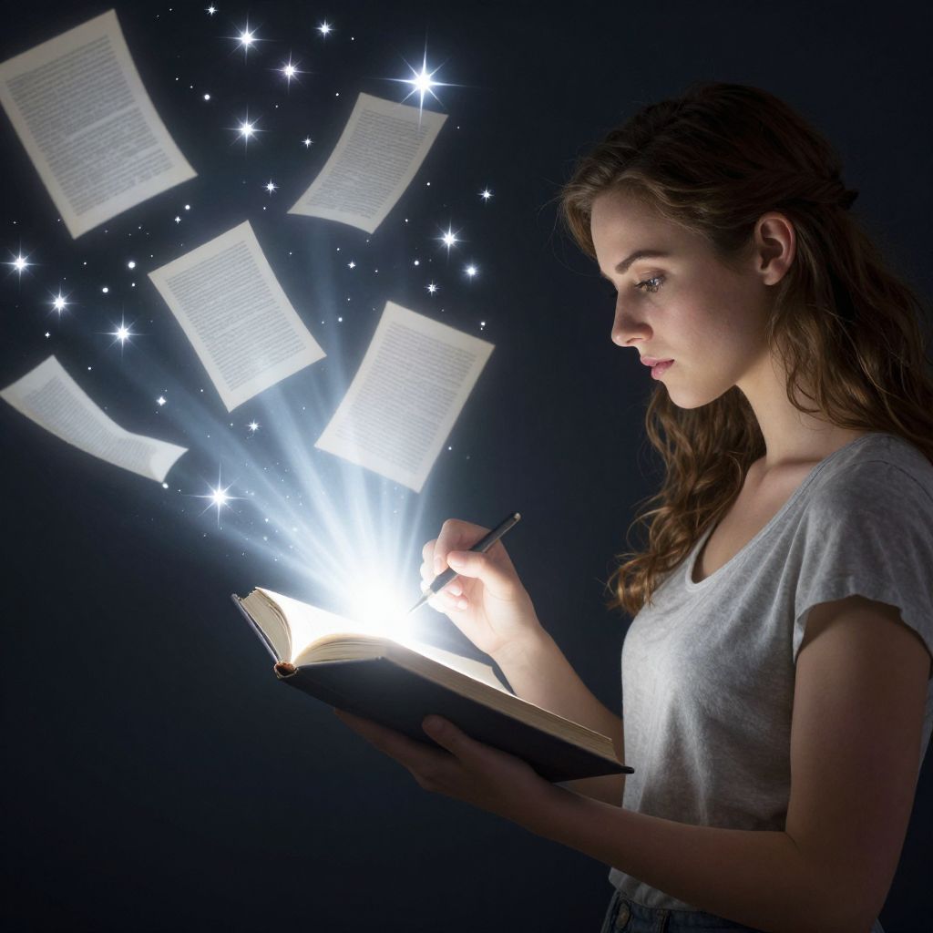 Photograph of a young woman with long brown hair and fair skin, wearing a light gray T-shirt, holding an open book in her left hand and a pen in her right. She is looking intently at the book with a glowing white light emanating from it, illuminating several floating, translucent pages in the dark background. The pages are scattered around, with sparkling stars surrounding them, creating a magical, ethereal effect. The woman's profile is well-lit, highlighting her focused expression. The background is completely black, emphasizing the luminous book and pages.