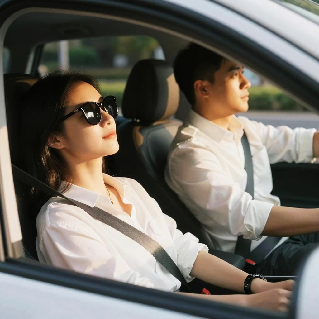 Photograph of the interior of a car with a woman's hands gripping the steering wheel in the foreground. She's wearing a patterned sleeve on her right arm. The windshield shows a rainy, overcast day with wet roads and green trees outside. The dashboard is black with a red button on the left. The word "Pinky" is visible on the right seat.