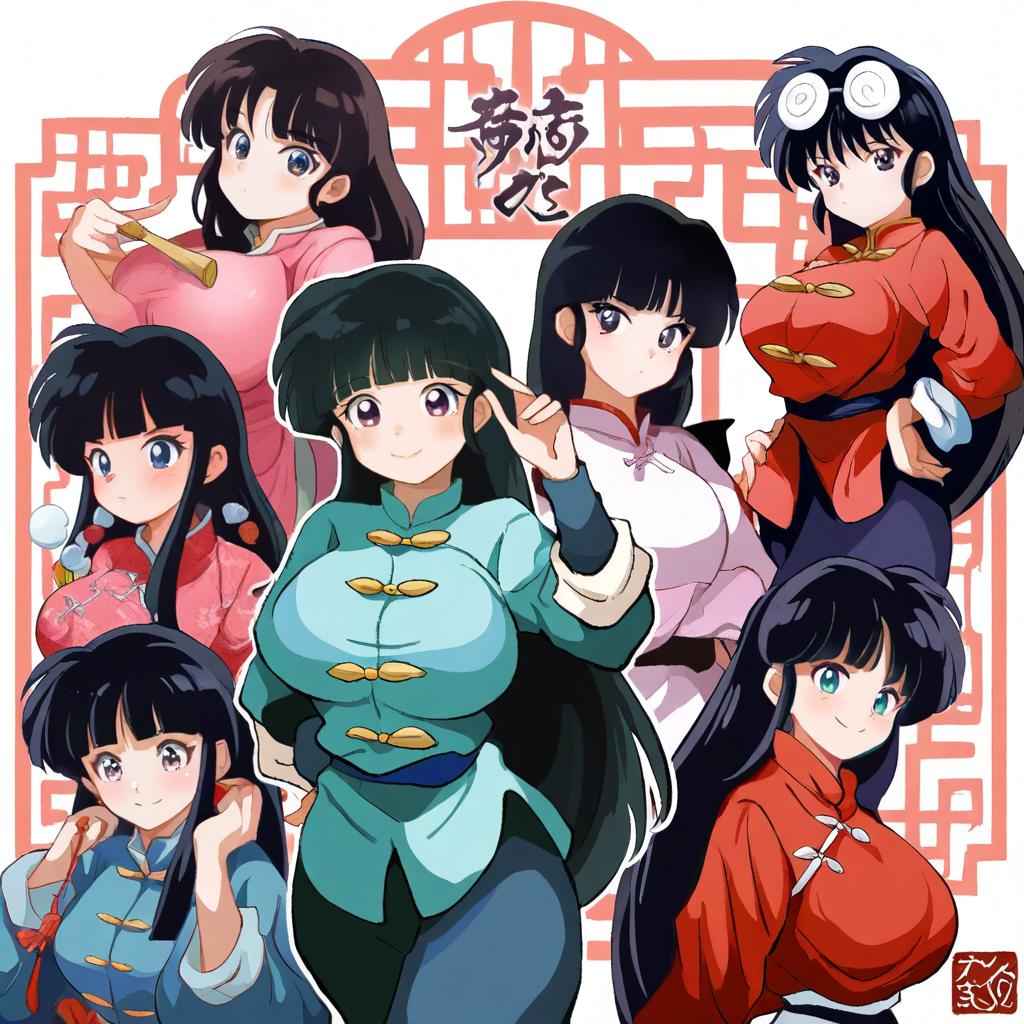 Mousse (ranma 1/2), ranma 1/2, 1girl, coke-bottle glasses, eyewear on head, long hair, black hair, blunt bangs, huge breasts, chinese clothes, chinese clothes, by artist oda takayuki, leet