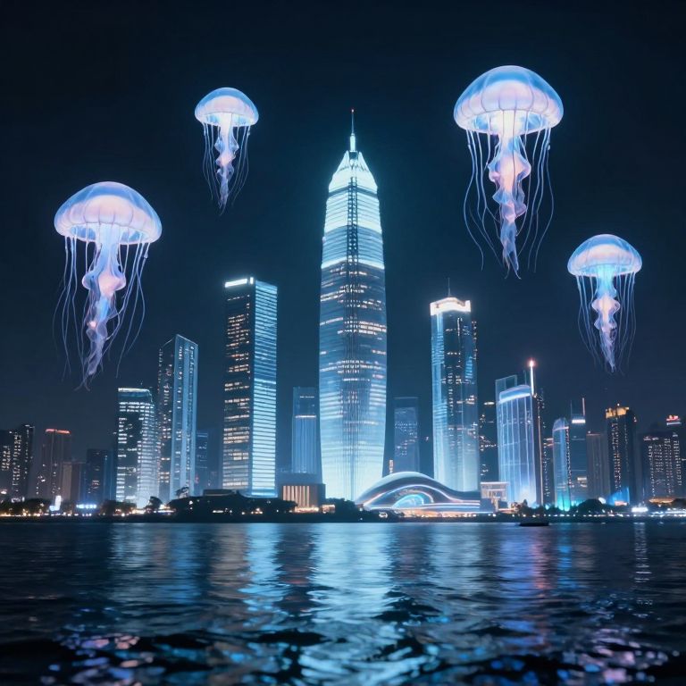 Photograph of a nighttime cityscape with a dark blue sky, featuring a prominent illuminated skyscraper in the center. Four glowing jellyfish with translucent blue and white lights float above the water in the foreground. Surrounding the central skyscraper are other brightly lit buildings with various neon lights. The water reflects the city lights, adding a shimmering effect. The jellyfish and city lights create a futuristic, surreal atmosphere. The image combines natural and urban elements in a visually striking composition.