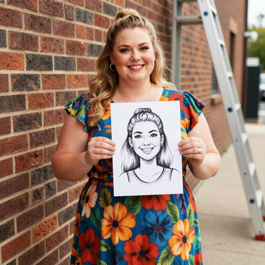 Photograph of a smiling, plus-sized woman with light skin and blonde hair in a loose ponytail, standing outdoors against a brick wall. She's wearing a colorful floral dress and holding a black-and-white sketch of her own smiling face, with detailed hair. She's standing on a concrete sidewalk with a white ladder in the background. The image has a bright, sunny feel.