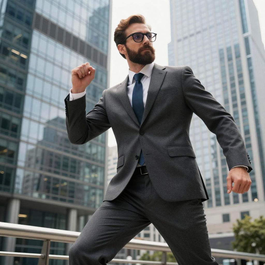 Beard and glasses on a confident businessman in an urban environment, sharp suit, glass skyscrapers behind, modern, professional, dynamic pose