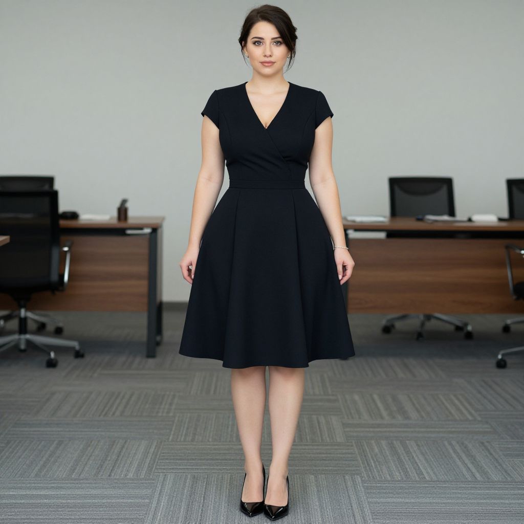 Full body shot, Pear-shaped body type woman, tailored V-neck dress, knee-length, structured bodice, soft crepe fabric, subtle sheen, cap sleeves, cinched waist, flared skirt, hidden side pockets, classic black color, paired with pointed-toe pumps, patent leather, sleek silhouette, minimalistic silver jewelry, delicate bracelet, stud earrings, chic updo hairstyle, natural makeup, confident pose, office setting background Sexy. Pretty face and beаutiful eyes. Big breasts