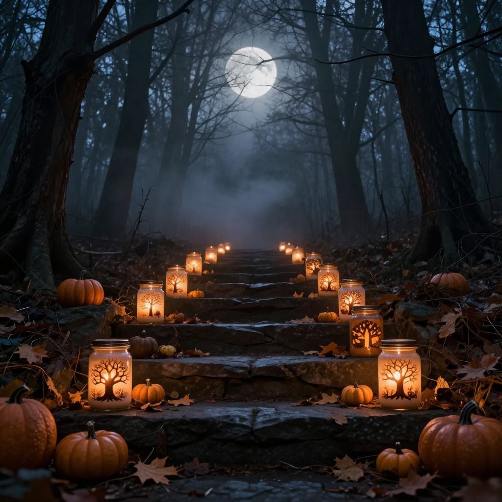 Photograph of a dark, misty forest path at night, illuminated by a full moon in the background. A stone steps leads forward, flanked by lit glass jars with orange glowing flames and carved pumpkins inside. Small pumpkins and autumn leaves are scattered along the steps. The tall, leafless trees create a spooky, eerie atmosphere. The jars' soft light contrasts with the dark, shadowy forest, enhancing the Halloween-themed setting.