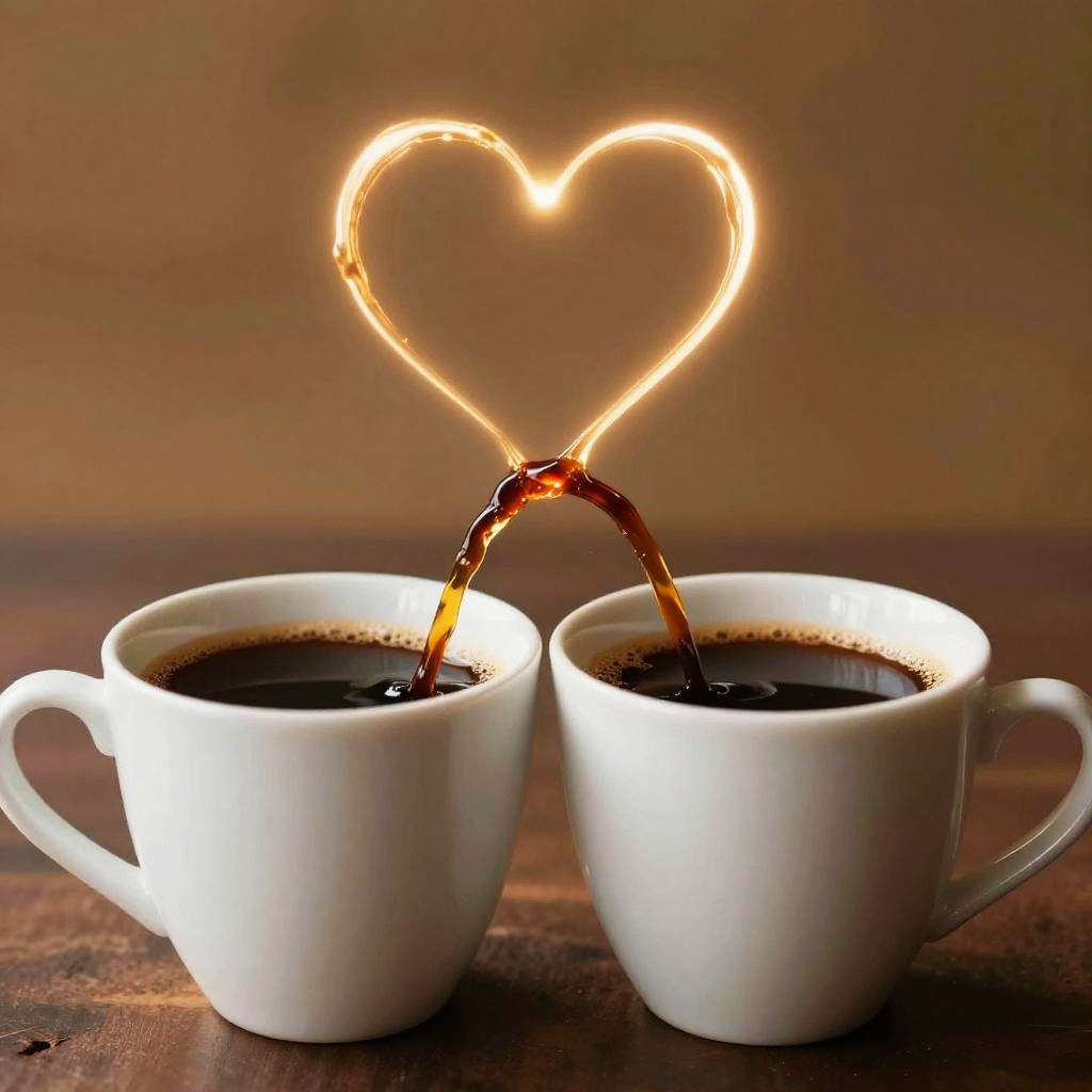 A photograph of two white ceramic cups filled with dark coffee. A stream of coffee creates a glowing heart shape in the air, connecting the two cups. The background is a warm, blurred gradient of brown and orange, adding a cozy feel. The coffee stream has a shiny, reflective quality, highlighting the heart shape. The cups are positioned close together on a flat surface.