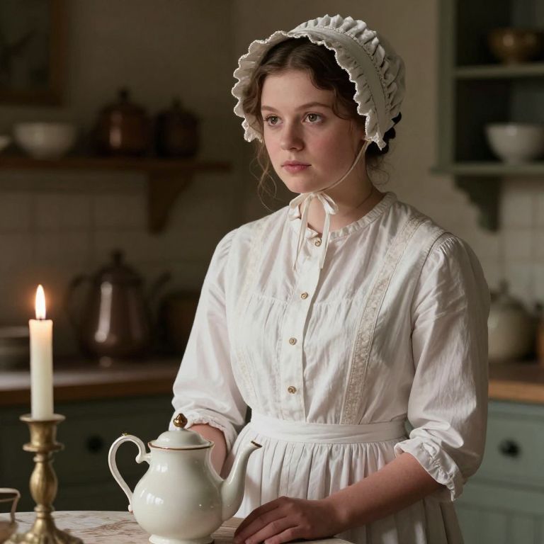Photorealistic shot of a Victorian-era servant girl in a modest version of regency fashion, wearing a plain muslin dress and a bonnet, standing at a candlelit kitchen table in a rural estate; she has a round face, warm brown eyes, and a modest expression, looking thoughtfully at a tea壶