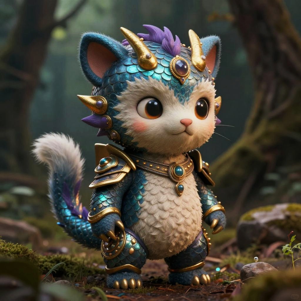 A highly detailed fantasy chibi creature resembling a small cat and bear hybrid, wearing intricate blue and gold dragon scale armor with purple accents. The character has big expressive eyes, soft white fur, and is set against a blurred forest background with natural lighting. The design features elaborate golden horns, gemstones, and ornamental details, creating a blend of mythical and cute aesthetics in a cinematic style.