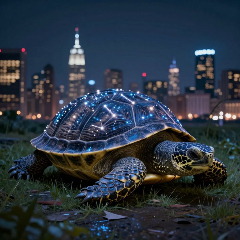 Photorealistic digital art of a glowing, cybernetic turtle with blue LED lights on its shell, set against a nighttime cityscape with illuminated skys