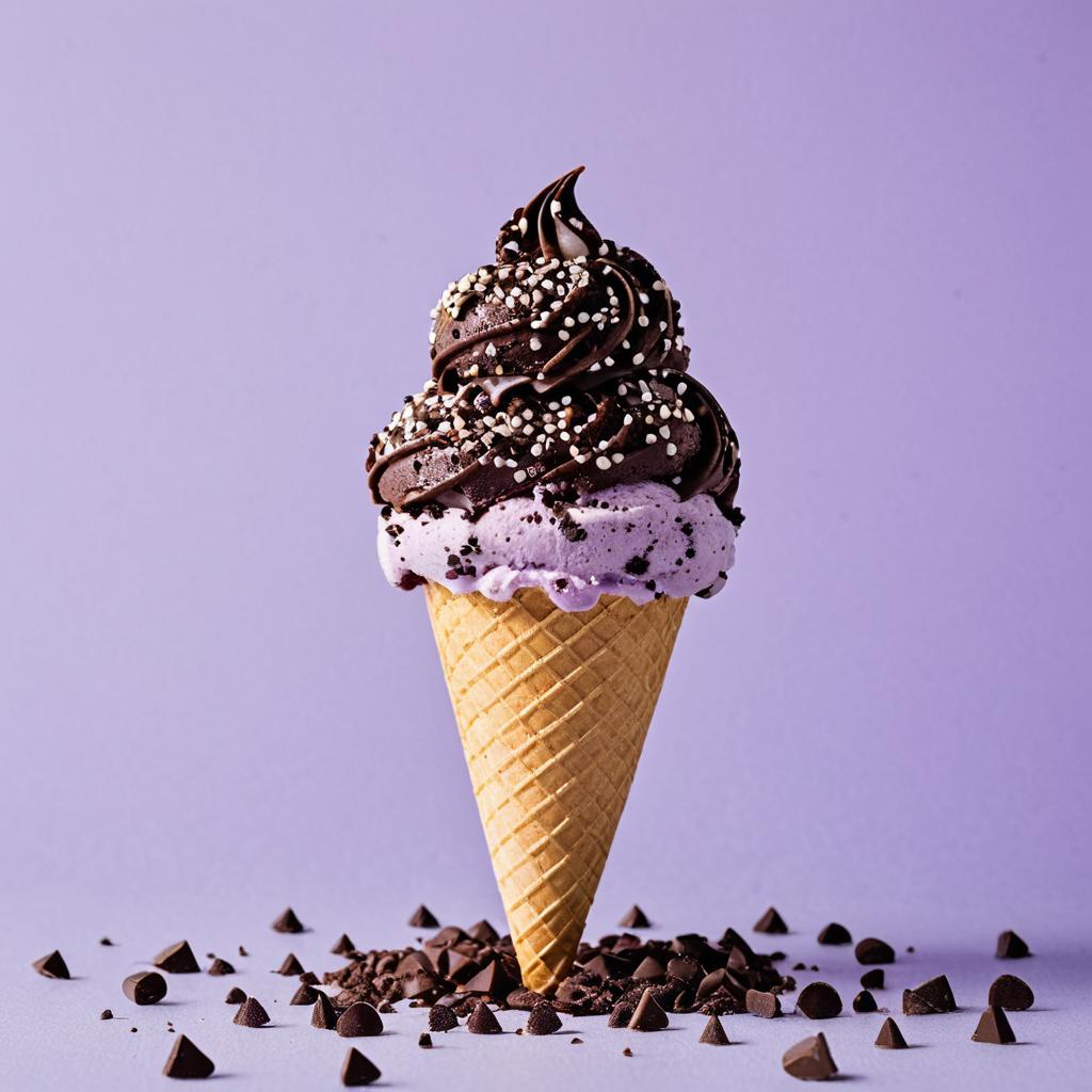 Blackberry ice cream cone with dark chocolate chips on top. The cone is isolated on a soft lavender background, highlighting the dessert. The ice cream cone appears to be melting slightly. The dark chocolate chips are scattered over the top of the ice cream and spread down the cone. The image conveys feelings of charm and delight with the rich natural tones of the sprinkles and the delicious taste of chocolate ice cream.