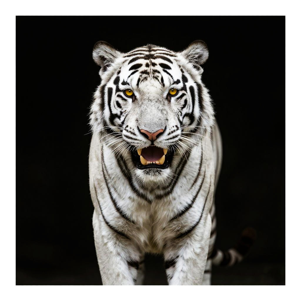 Tiger, no humans, black background, yellow eyes, open mouth, teeth, simple background, solo, fangs, looking at viewer, sharp teeth, tongue, portrait, animal, whiskers, artist name, white tiger, yellow sclera, animal focus, border