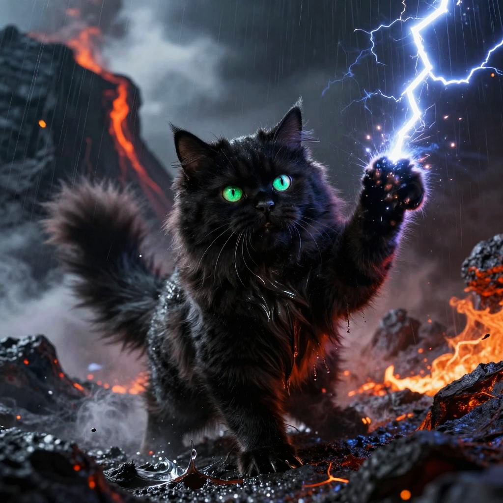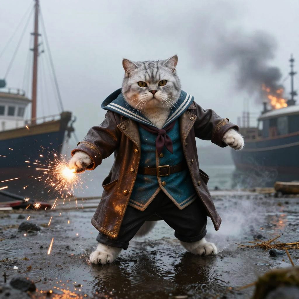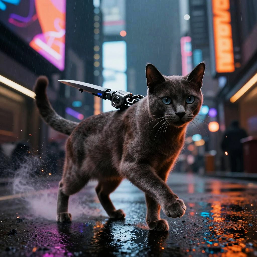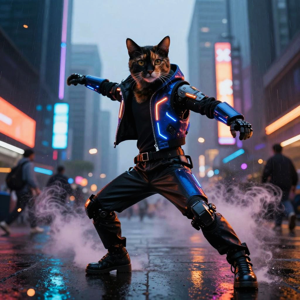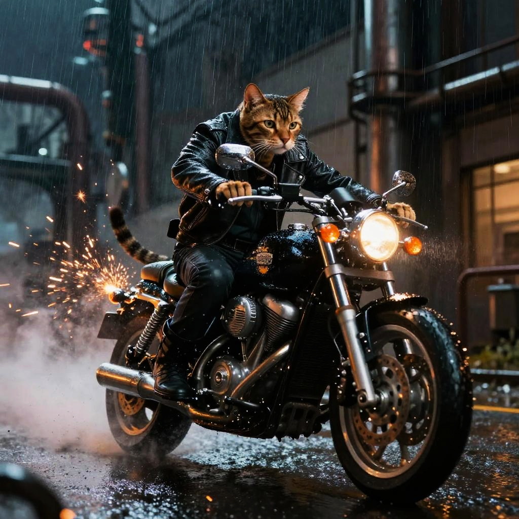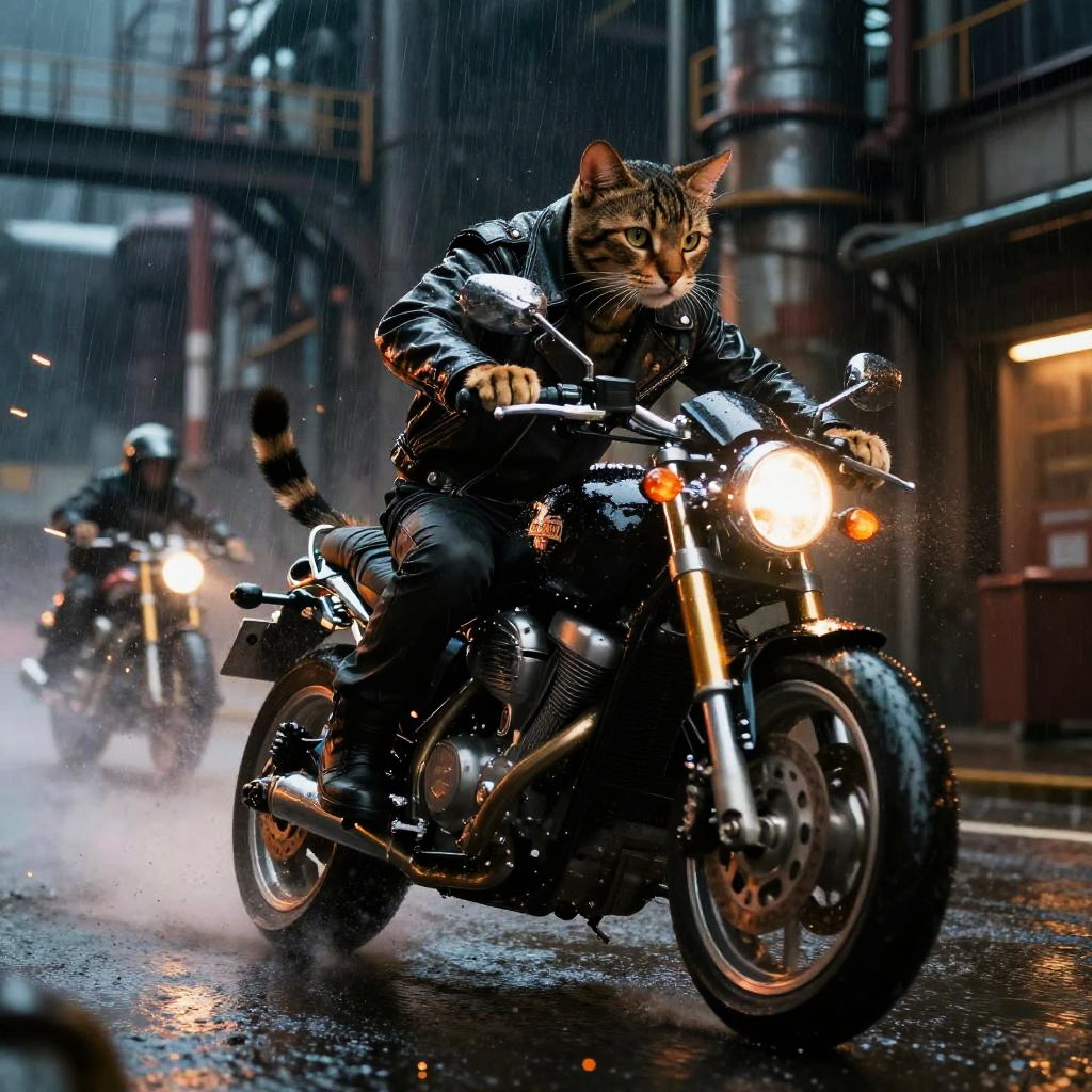 (full body) compact spotted Ocicat, fierce motorbike gang leader with leather jacket, in rain-soaked industrial district at night, black, orange, and blue predominate, hyper-detailing, hyper-realism, tack sharp, cinematic splash screen energy, action-packed composition, dynamic pose, rain and sparks, smoke plumes, glossy reflections, dramatic rim light, volumetric fog, motion blur trails, embers, HDR, film grain, photoreal lighting, rich textures, epic mood