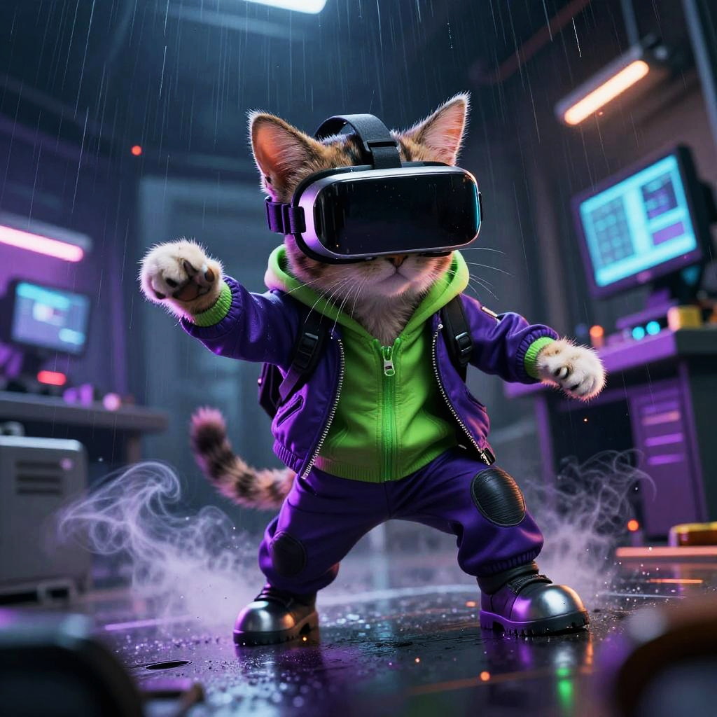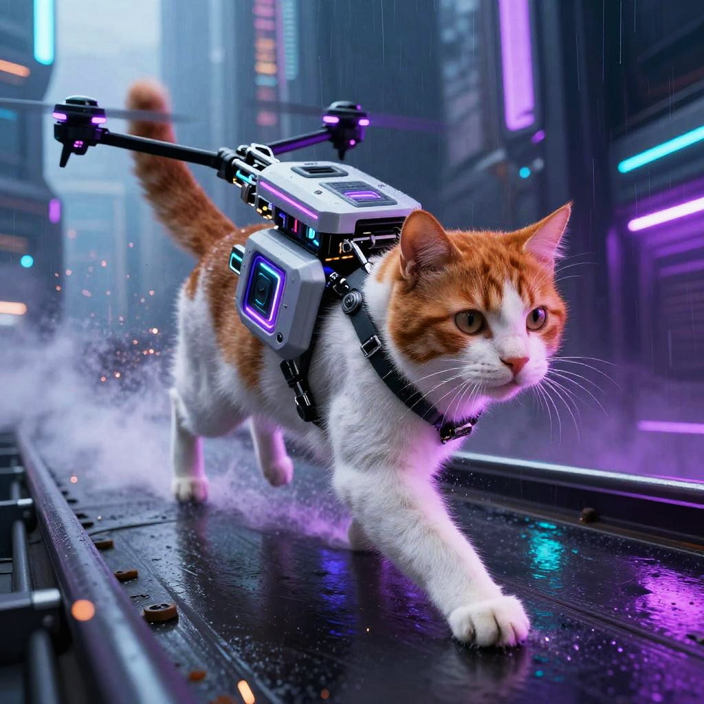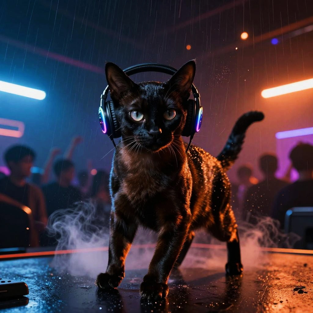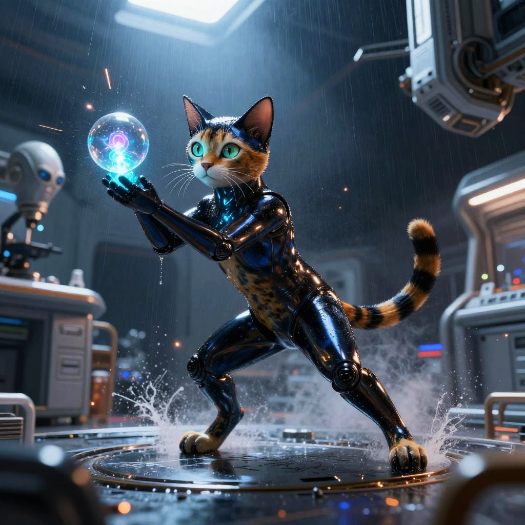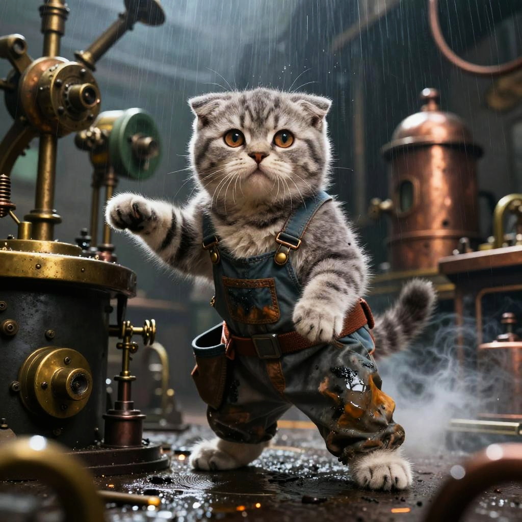 (full body) compact spotted Ocicat, fierce motorbike gang leader with leather jacket, in rain-soaked industrial district at night, black, orange, and blue predominate, hyper-detailing, hyper-realism, tack sharp, cinematic splash screen energy, action-packed composition, dynamic pose, rain and sparks, smoke plumes, glossy reflections, dramatic rim light, volumetric fog, motion blur trails, embers, HDR, film grain, photoreal lighting, rich textures, epic mood